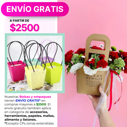 Nuestras bolsas y empaques tienen ENVÍO GRATIS* en compras mayores a $2500 MXN. El envío gratuito también aplica en categoría de papel, listones, accesorios, herramientas, mallas y alimento para flores.