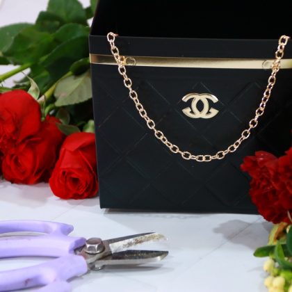 - Bolso de cartón con cadenita en color oro