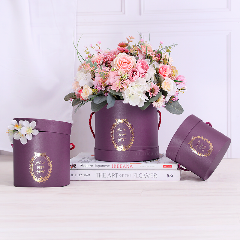 Hermoso juego de 3 cajas hechas de cartón rígido en forma de cilindro especial para flores.