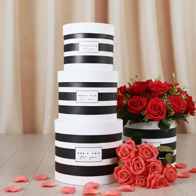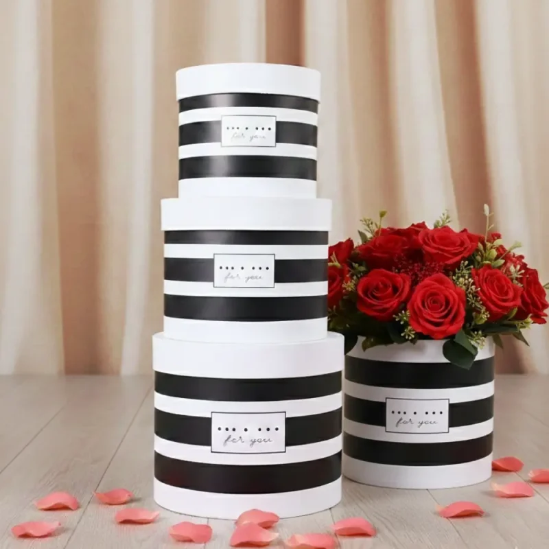 - Set de 3 cajas de cartón rígido cilindrico con lineas blanco y negro