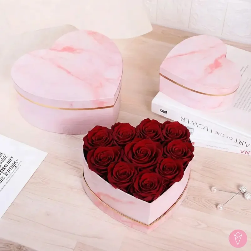 - Set de 3 cajas en forma de corazón hechas de cartón rígido.