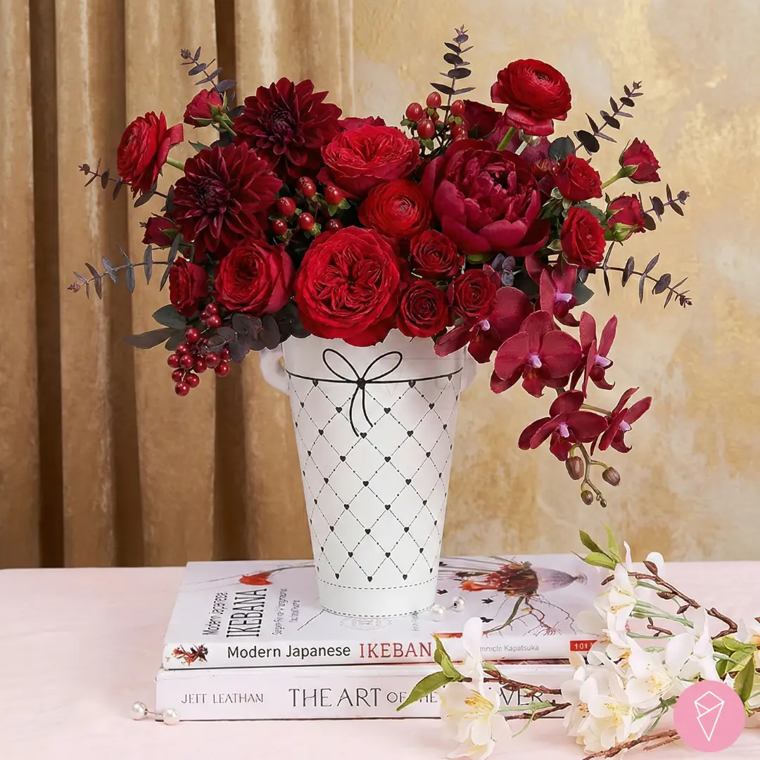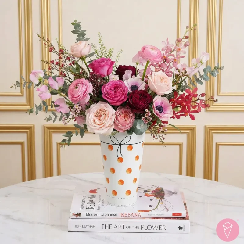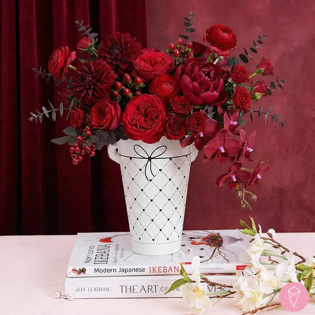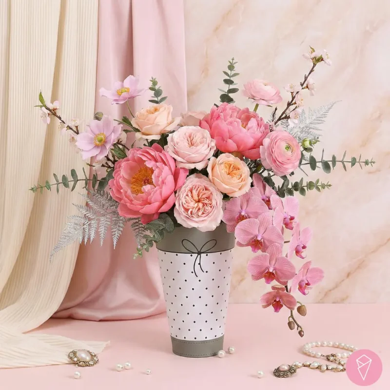 Esta caja de cartón rígido tipo cono para regalos o arreglos de flores, estampadas. No incluye flores.