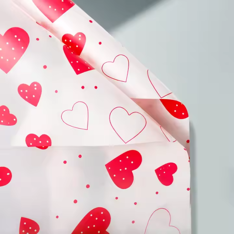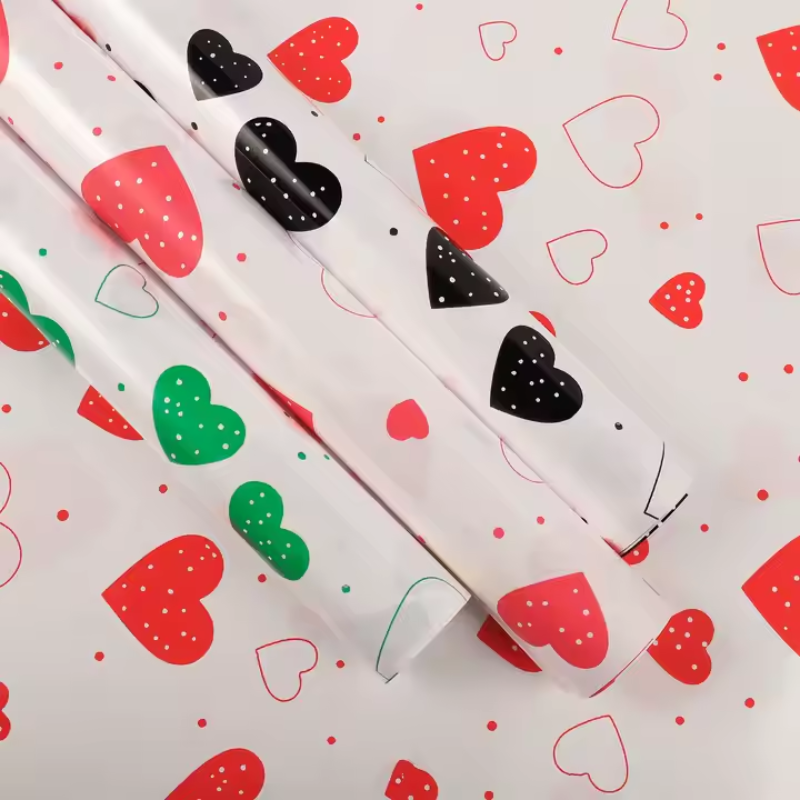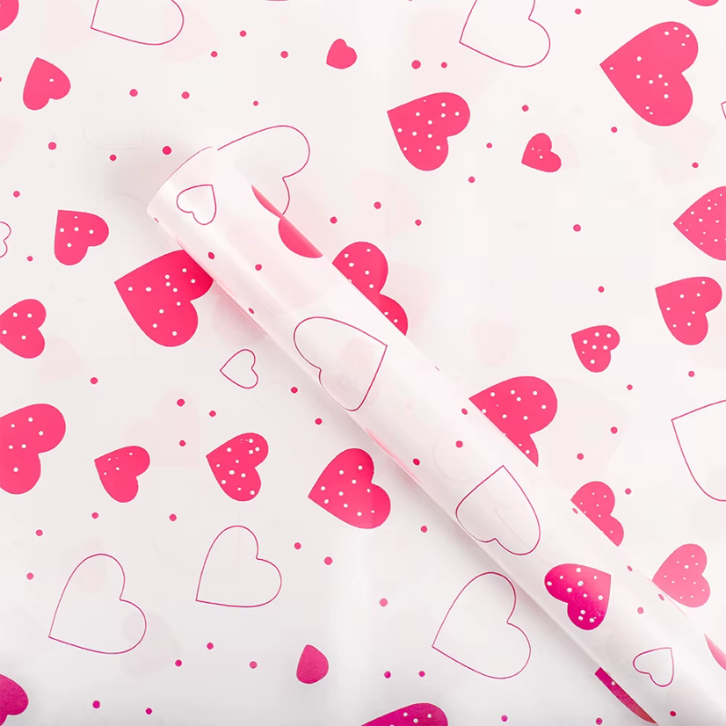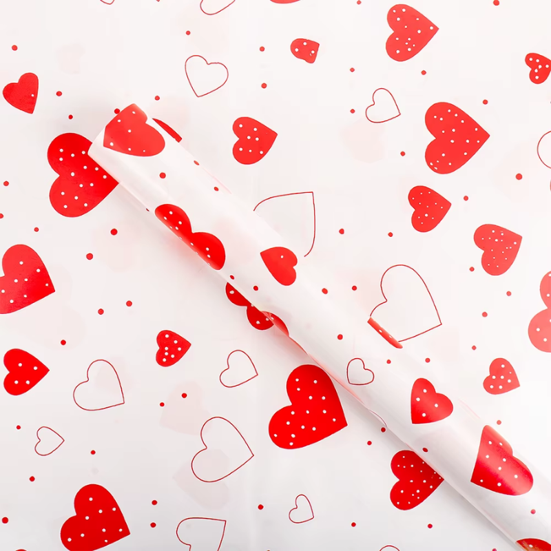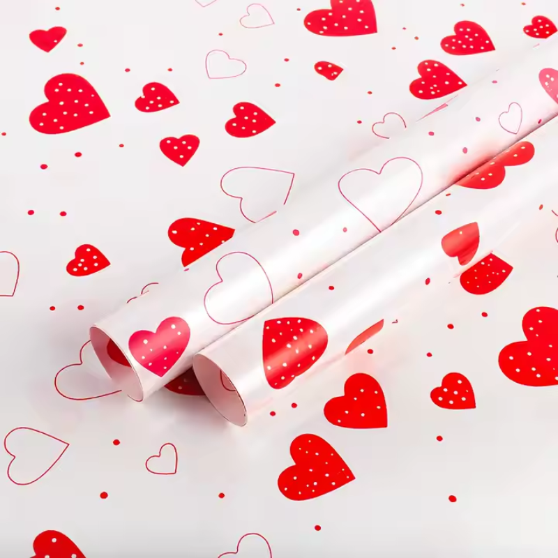 - Celofán coreano con corazones, versátil ideal para envolver flores, regalos y otras manualidades.